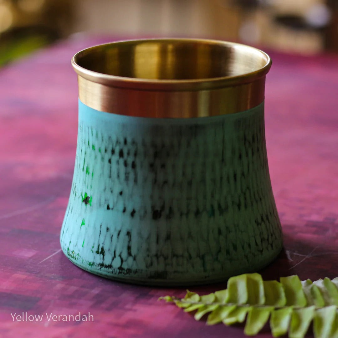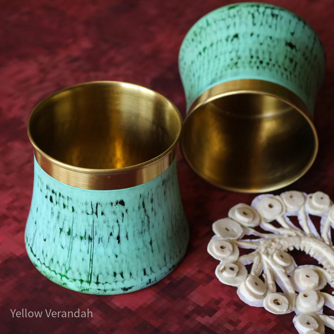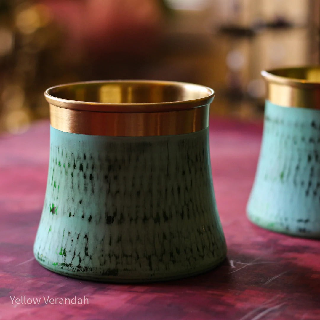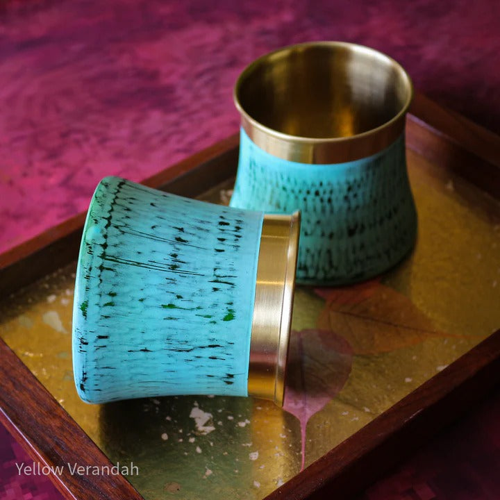 Inspired by radical beauty of Zamindari aristocracy and Mughal Patina finished servingware, these Pure Brass Patina Sharbat Glasses are Created beyond utility. The shape and fine handcrafted Patina finish will remind you our rich culinary & culture !!!