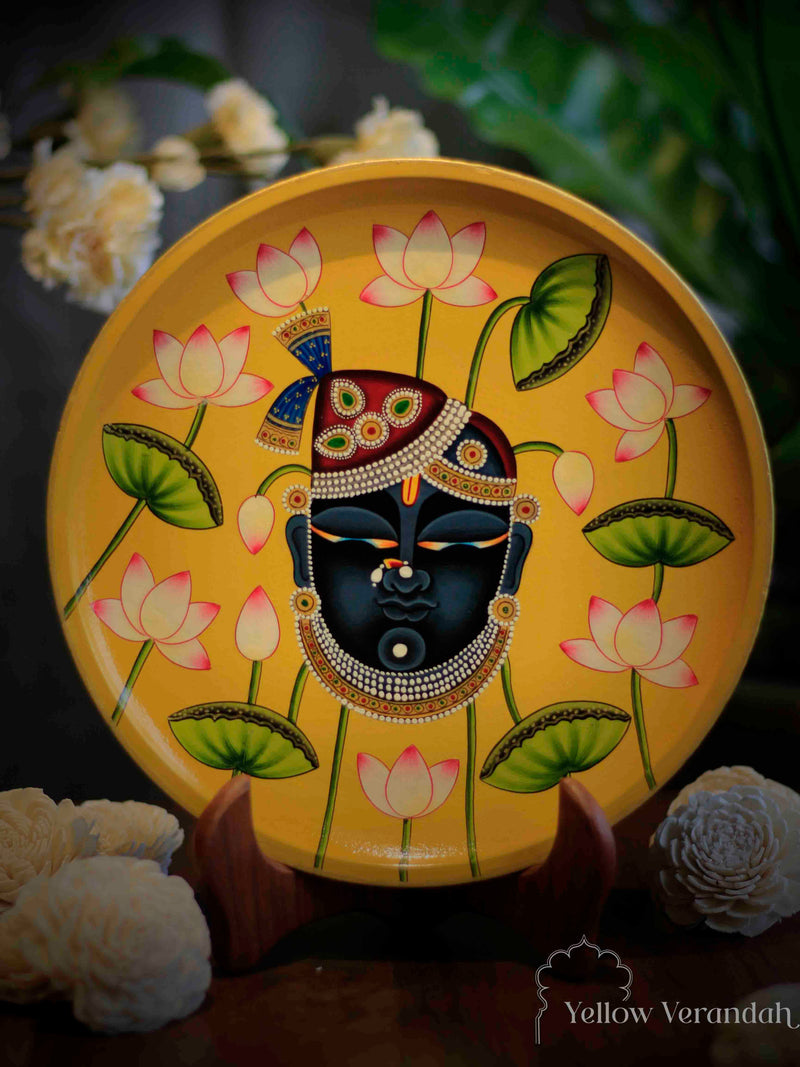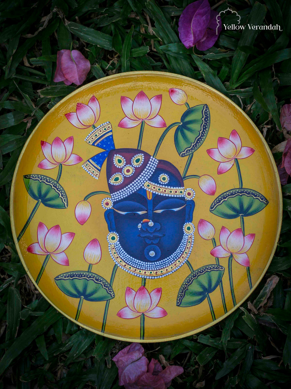 Celebrate timeless tradition with this Pichwai Krishna Handpainted Wall Plate, inspired by the grandeur of Pichwai paintings from Rajasthan. Each pichwai painting beautifully narrates tales of Lord Krishna, Radha, and divine nature motifs, handpainted with precision by local artisans. Crafted on a 10" wooden plate, it’s a perfect piece of pichwai art for your wall or table decor.